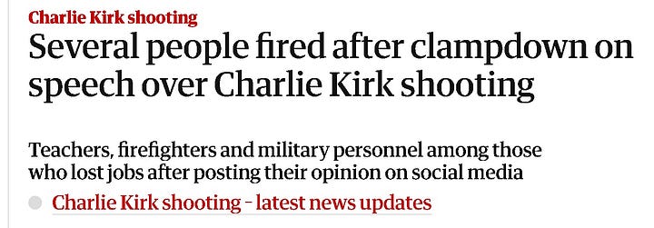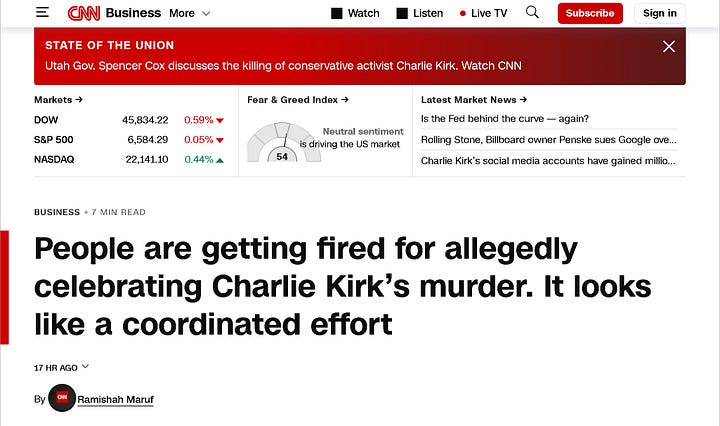 DoG runs an excellent Substack that I encourage people to follow. It was thanks to him that I came across the image above:3 people celebrating and capitalisming capitalizing on the cold-blooded murder of a man in public, in broad daylight, in front of a crowd of hundreds and countless more watching online. Including his wife and children. A man they’d never met. A husband, a father. And by most accounts I’ve heard (for what precious little that is worth) a rather good one. A God-fearing, tax-paying American citizen. Not some petty thug. Not some megalomoniacal murderer-rapist.4 At worst, a guy. A guy with some contentious political opinions and a bit of clout. To be fair, it is a bit disingenuous of me to frame it that way, but you get the point. More on this later.